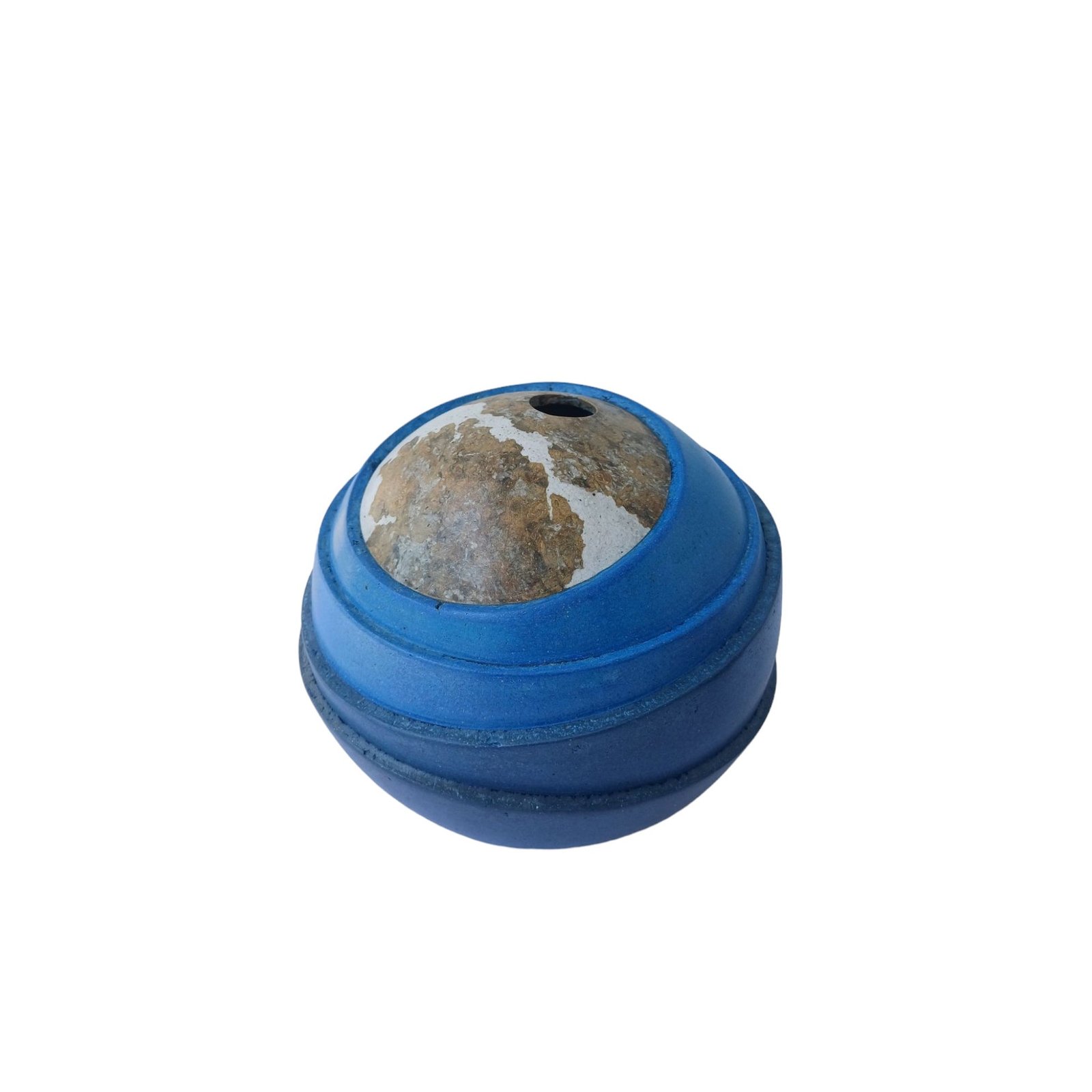 Paper mache is a fun and easy way to create decorative or functional objects from recycled materials. This vase appears as a ceramic blue sphere with a white stone ball, however it is made from our everyday used paper.