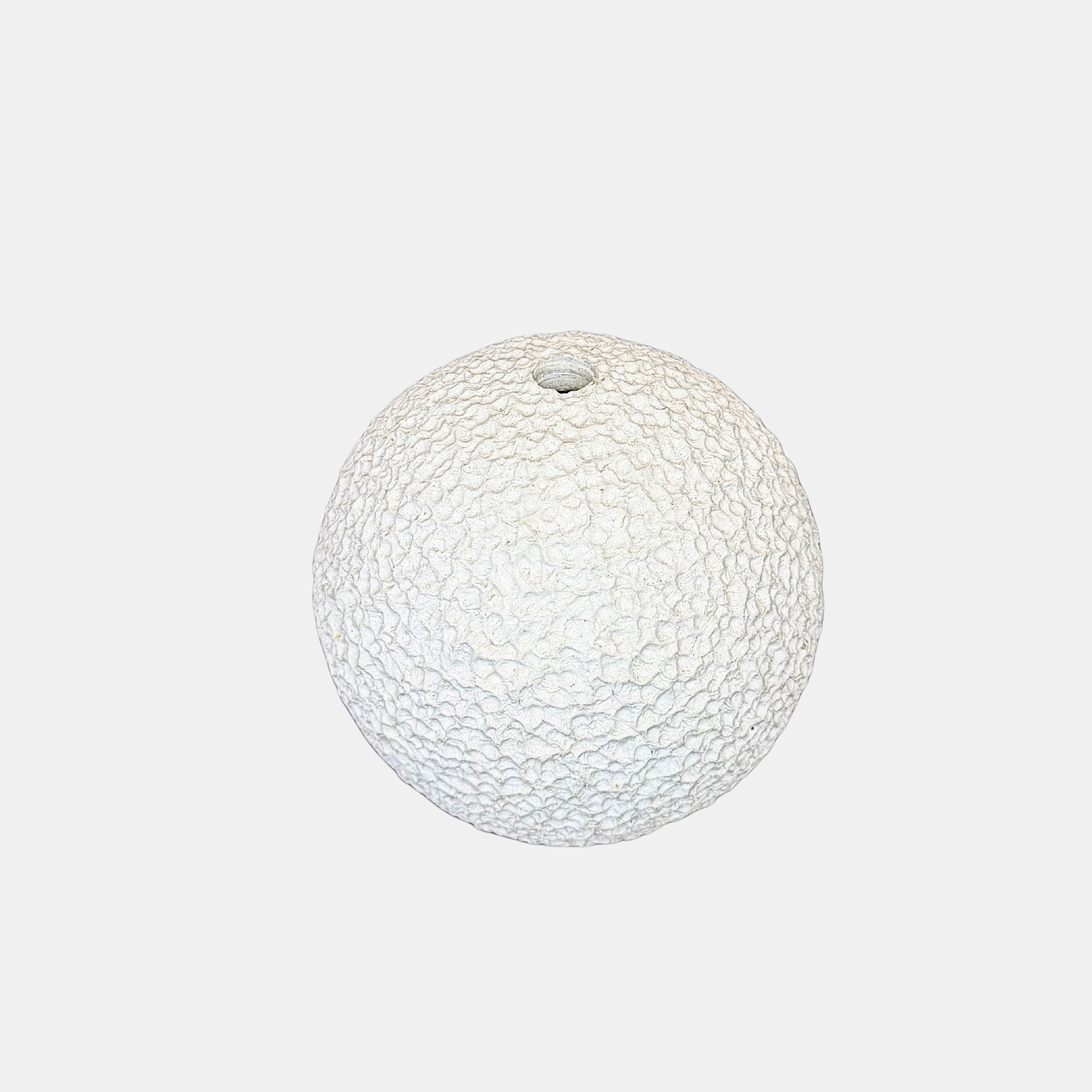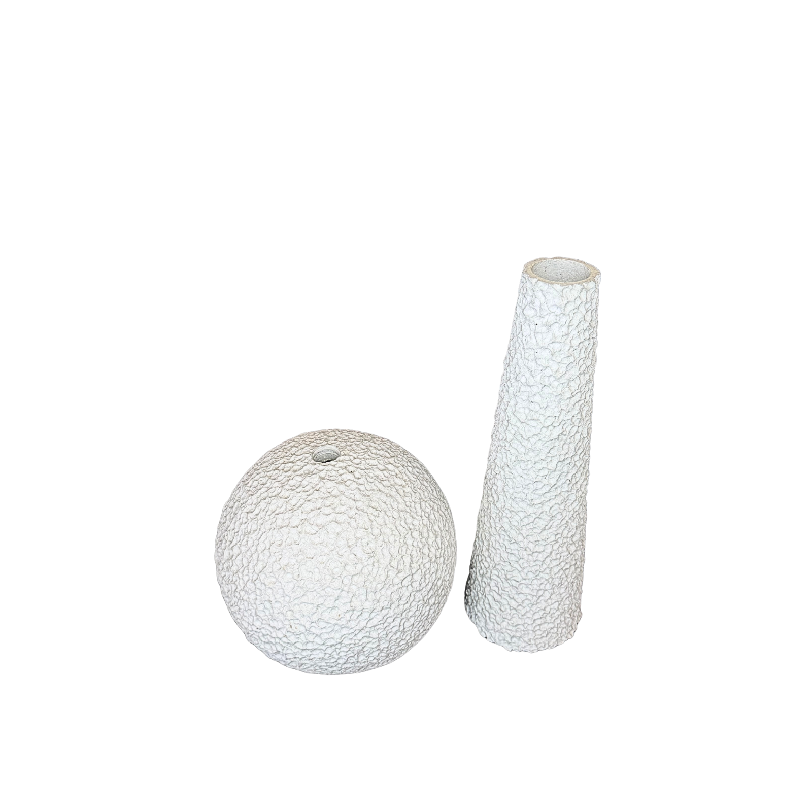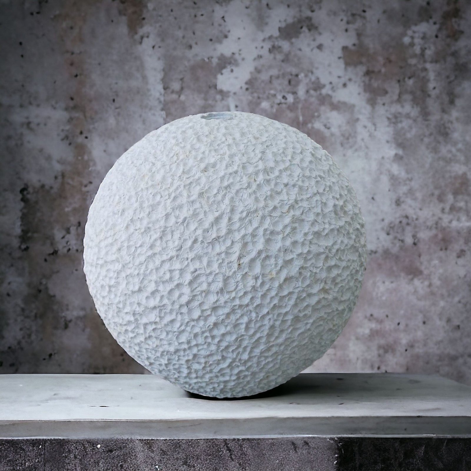 A one-of-a-kind vase crafted with a paper mache technique, mimicking the rugged texture and earthy tones of cement.