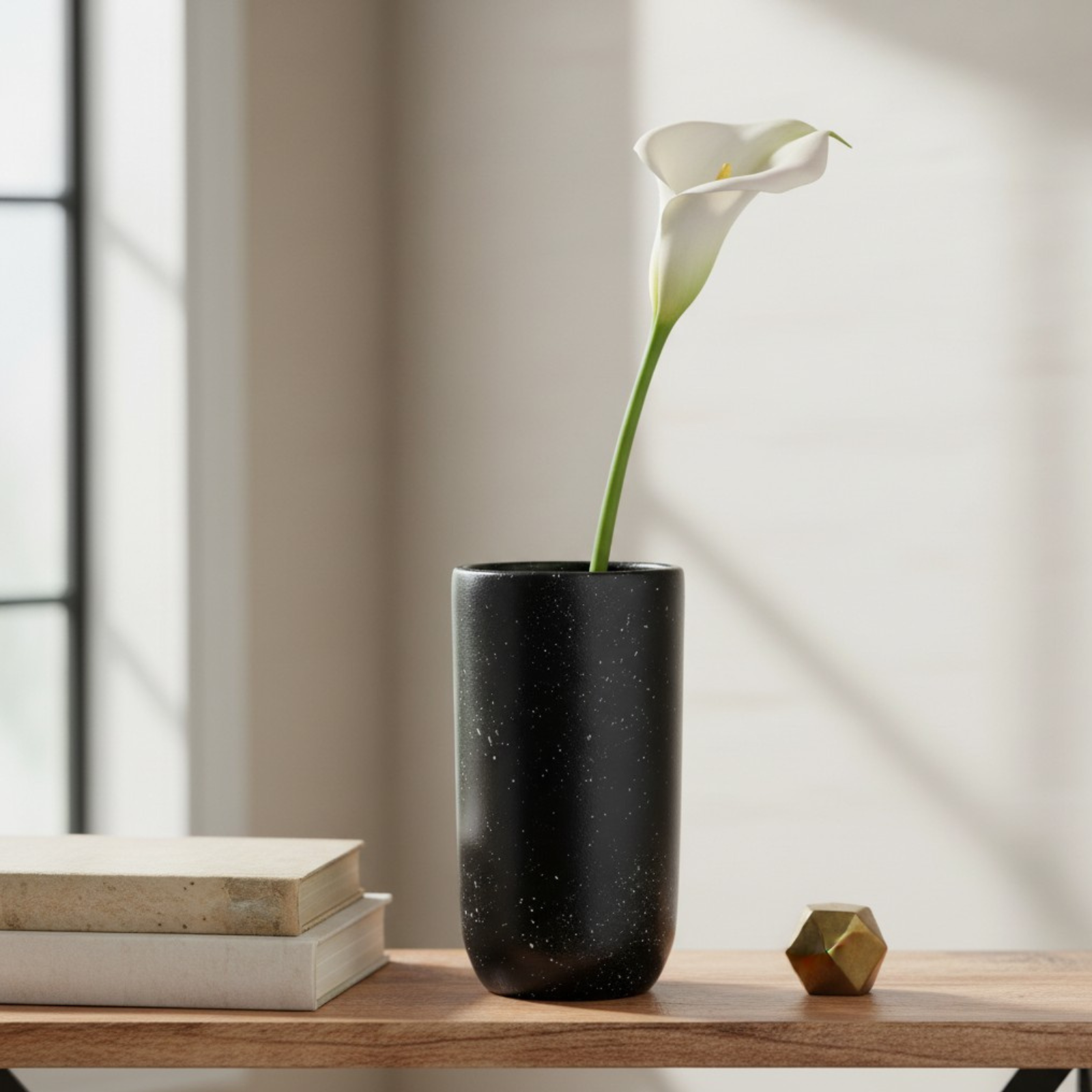 Elevate your interior space with this sleek black speckled ceramic vase. Featuring a deep matte black finish accented with subtle white speckles, this cylindrical vase offers a modern, sophisticated aesthetic that complements a variety of decor styles—from industrial to minimalist to contemporary.