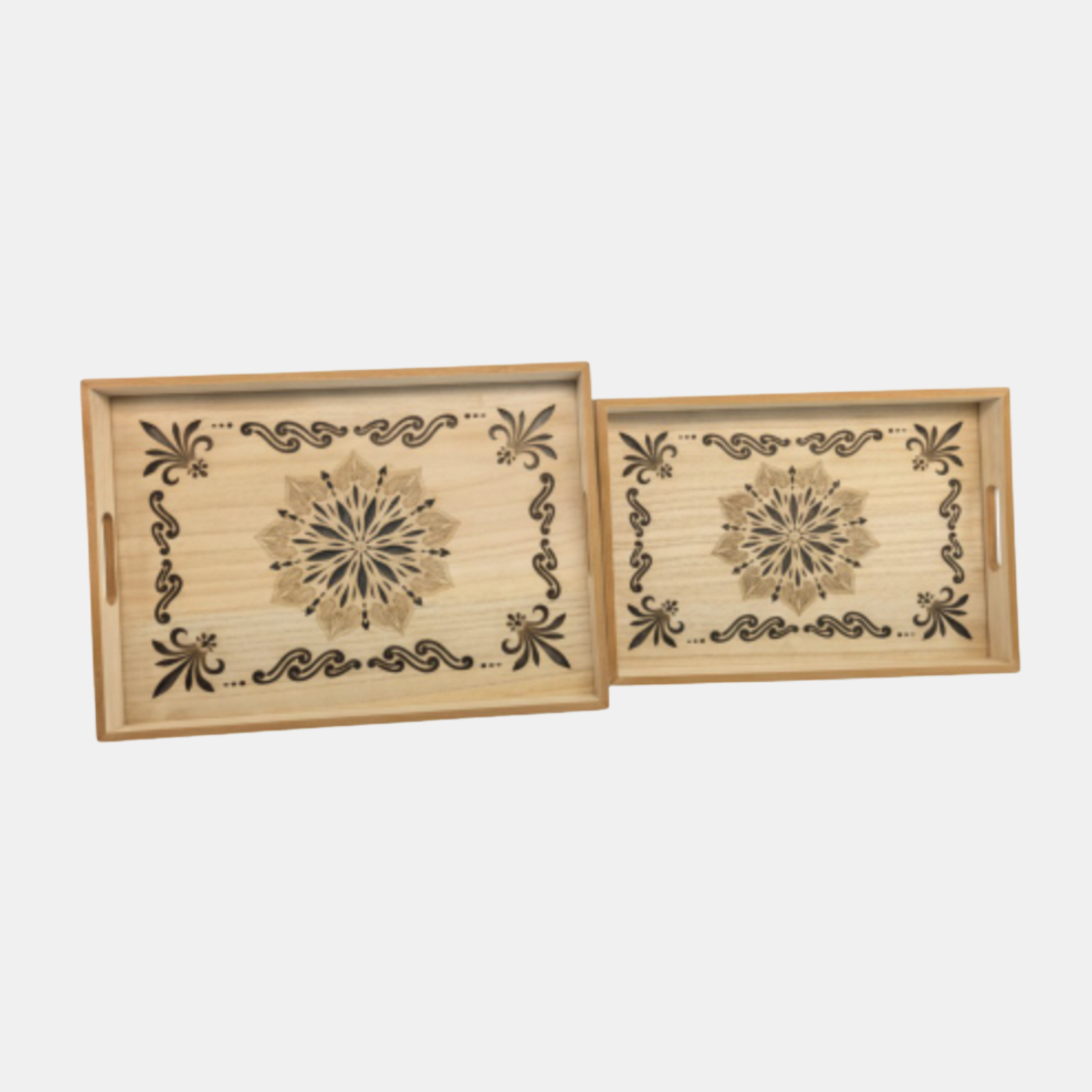 Crafted from high-quality, lightweight wood and finished with a smooth protective layer, these pieces are designed to showcase the natural beauty of the grain while offering a unique 3D visual depth. Each tray features intricate, layered laser-cut designs.