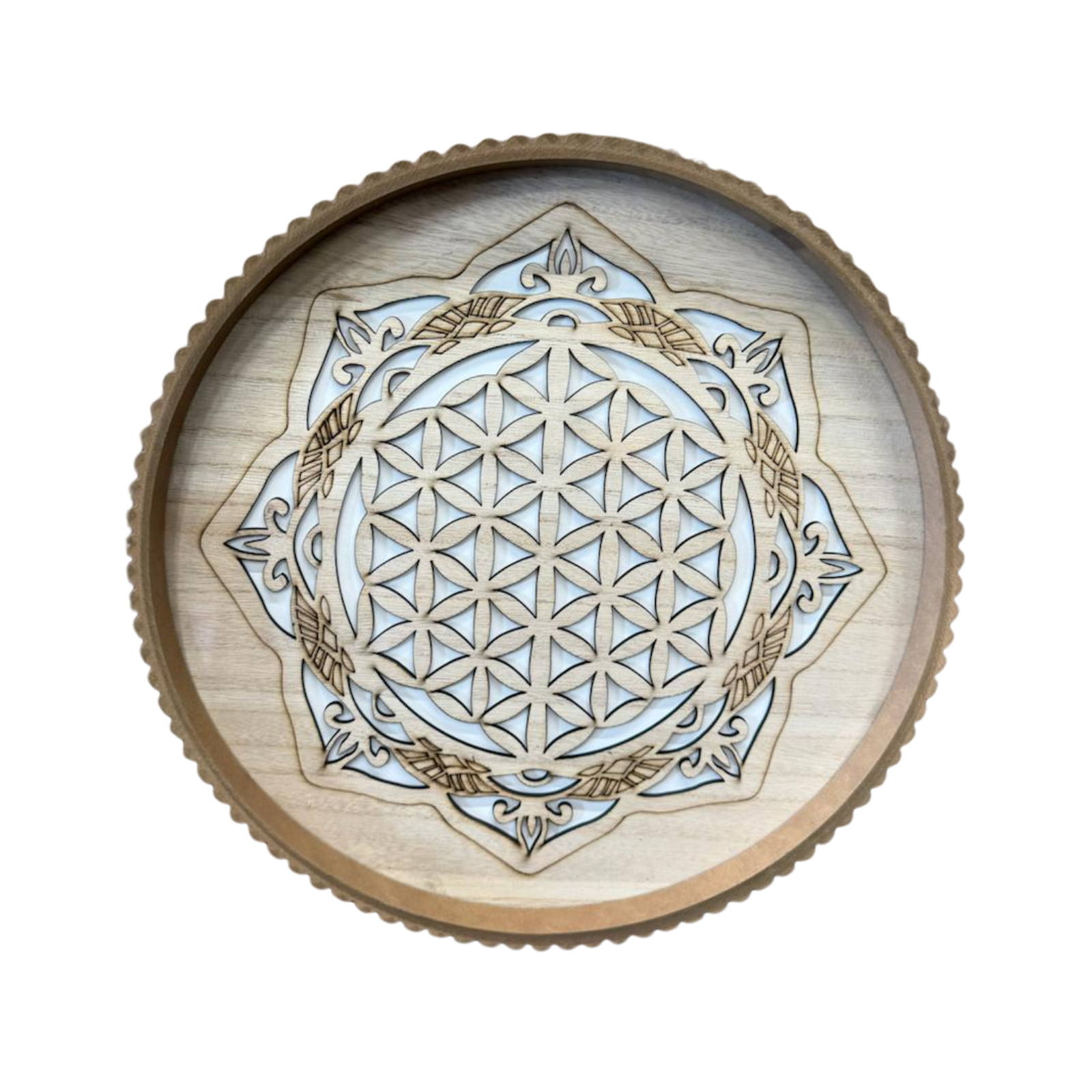 Crafted from high-quality, lightweight wood and finished with a smooth protective layer, these pieces are designed to showcase the natural beauty of the grain while offering a unique 3D visual depth. Each tray features intricate, layered laser-cut designs.